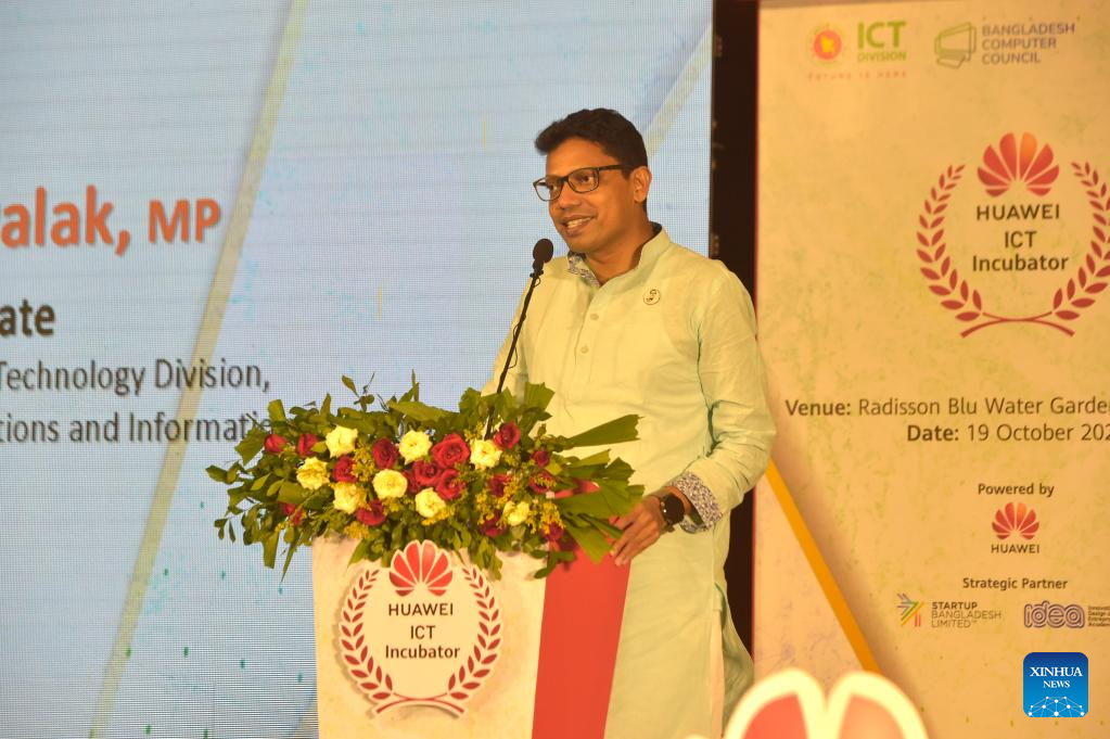 Zunaid Ahmed Palak, Bangladesh's Minister of State for ICT (Information and Communication Technology) under the Ministry of Posts, Telecommunications and Information Technology, addresses a gala event in Dhaka, Bangladesh, Oct. 19, 2022. Huawei Bangladesh has announced six startups as winners of the Huawei ICT Incubator 2022 program in Bangladesh. The announcement came in a gala event held here on Wednesday. (Xinhua)