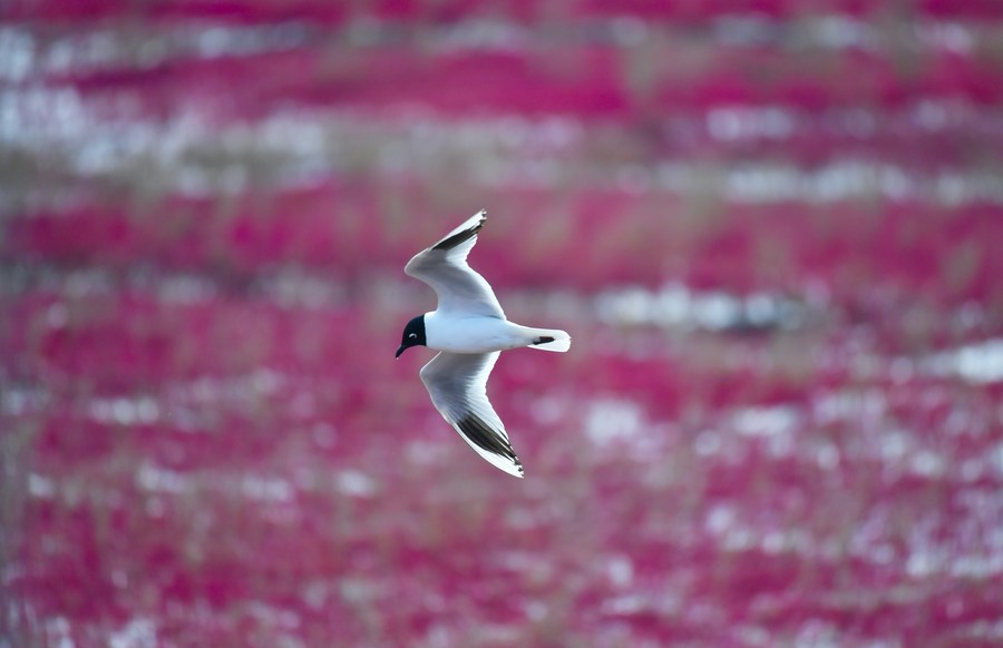 A black-billed gull flies over a breeding area in a wetland in Liaohe River delta in Panjin, northeast China's Liaoning Province, May 5, 2022. (Xinhua/Yang Qing)