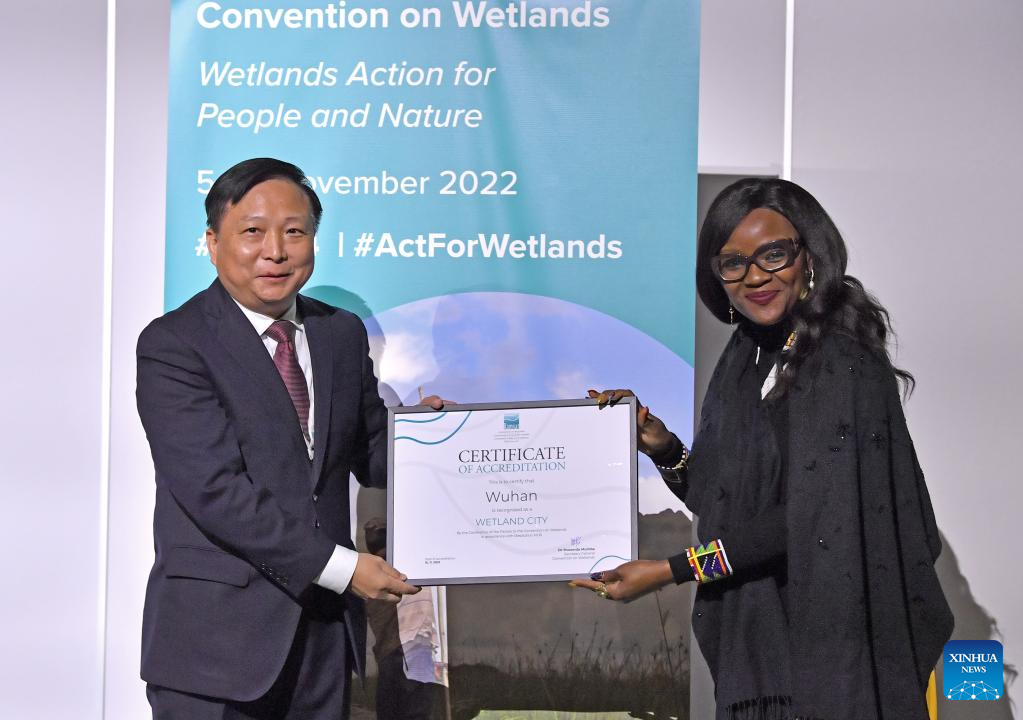 Musonda Mumba (R), secretary-general of the Ramsar Convention, gives the certificate of accreditation that recognises Wuhan of central China's Hubei Province as the international wetland city to a Chinese representative during the 14th Meeting of the Conference of the Contracting Parties (COP14) to the Ramsar Convention on Wetlands, in Geneva, Switzerland, Nov. 10, 2022. Twenty-five cities from 13 countries, notably seven from China, were accredited on Thursday by the Ramsar Convention as international wetland cities. (Xinhua/Lian Yi)