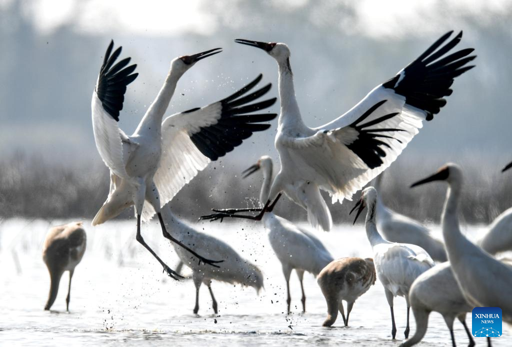 This photo taken on Dec. 3, 2019 shows white cranes at a crane sanctuary in Nanchang, capital of east China's Jiangxi Province. Nanchang has two wetlands of international importance, eight national wetland parks, four wetlands of provincial importance and five provincial wetland parks. It was accredited on Nov. 10, 2022 by the Ramsar Convention as an international wetland city. (Xinhua/Zhou Mi)