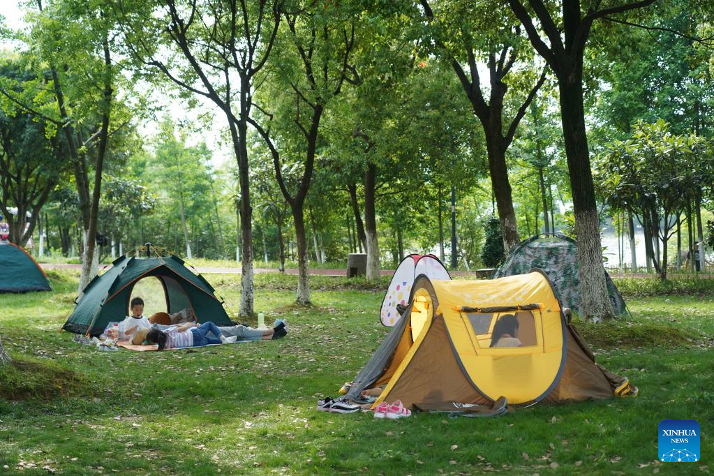 This photo taken on May 2, 2021 shows local residents camping at Aixi Lake wetland park of Nanchang, capital of east China's Jiangxi Province. Nanchang has two wetlands of international importance, eight national wetland parks, four wetlands of provincial importance and five provincial wetland parks. It was accredited on Nov. 10, 2022 by the Ramsar Convention as an international wetland city. (Xinhua/Wan Xiang)