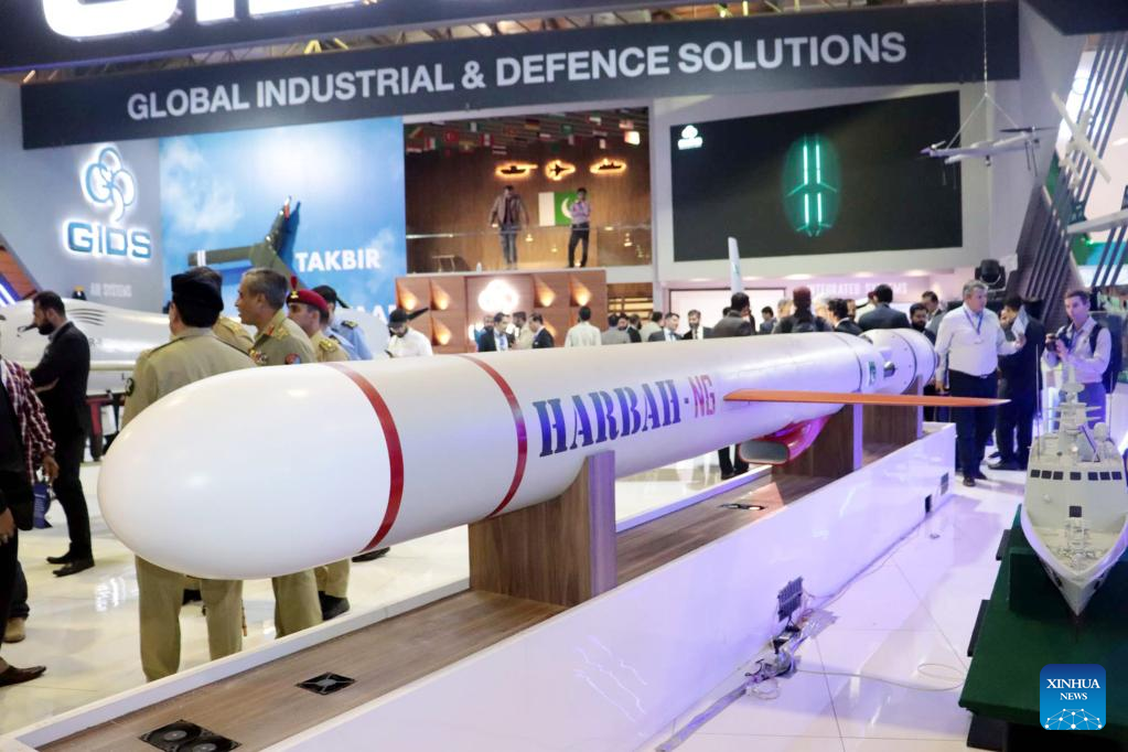 People visit the International Defense Exhibition and Seminar (IDEAS) in Karachi, Pakistan on Nov. 16, 2022. The 11th edition of IDEAS is held at the Karachi Expo Center in Pakistan's southern port city of Karachi. (Str/Xinhua)