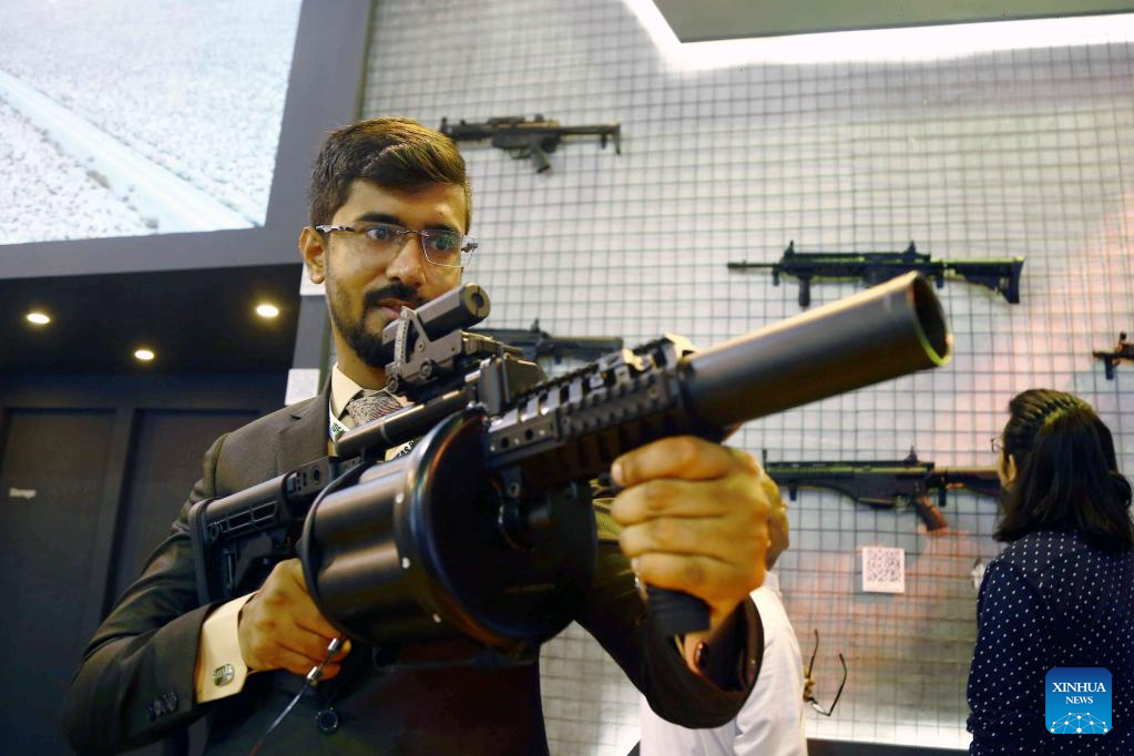 A man checks a gun at the International Defense Exhibition and Seminar (IDEAS) in Karachi, Pakistan on Nov. 16, 2022. The 11th edition of IDEAS is held at the Karachi Expo Center in Pakistan's southern port city of Karachi. (Str/Xinhua)