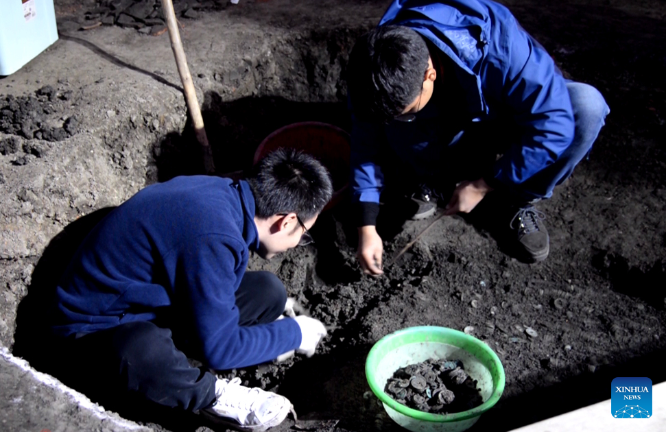 Staff members work at the archaeological site of an ancient coin hoard in Jianhu County, Yancheng City, east China's Jiangsu Province, Oct. 23, 2022. An ancient coin hoard containing 1.5 tonnes of coins dating back to the Tang (618-907) and Song (960-1279) dynasties has been discovered in east China's Jiangsu Province.(Xinhua)