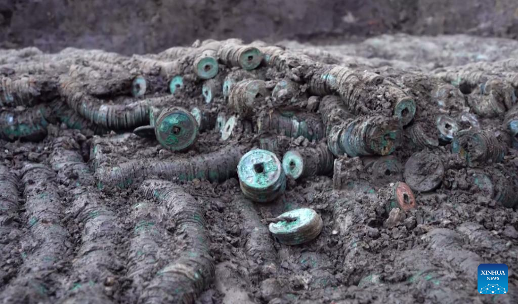 Ancient coins are unearthed in Jianhu County, Yancheng City, east China's Jiangsu Province, Oct. 23, 2022. An ancient coin hoard containing 1.5 tonnes of coins dating back to the Tang (618-907) and Song (960-1279) dynasties has been discovered in east China's Jiangsu Province.(Xinhua)