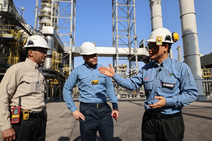 Workers communicate at the Yanbu Aramco Sinopec Refining Company (YASREF) in Yanbu, Saudi Arabia, Nov. 27, 2022. (Xinhua/Wang Haizhou)