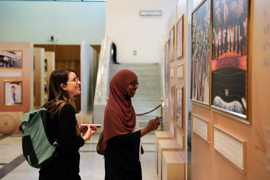 People visit a photo exhibition showcasing the friendly exchanges and cooperation between China and Arab countries in Riyadh, Saudi Arabia, Dec. 7, 2022.(Xinhua/Wang Dongzhen)
