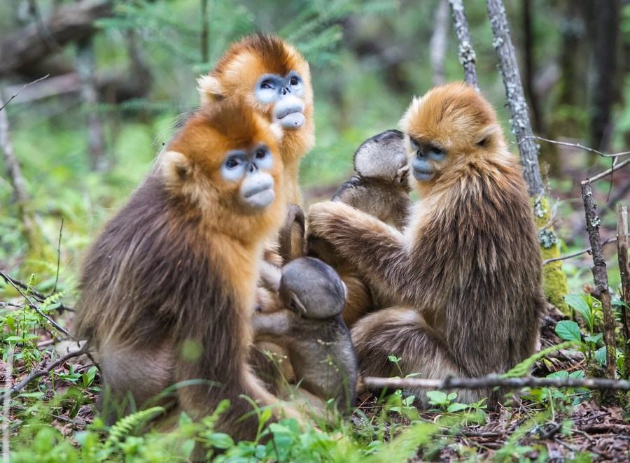 This photo taken on May 19, 2021 shows golden snub-nosed monkeys at Dalongtan Golden Monkey Research Center in Shennongjia National Park of central China's Hubei Province. (Xinhua/Xiao Yijiu)