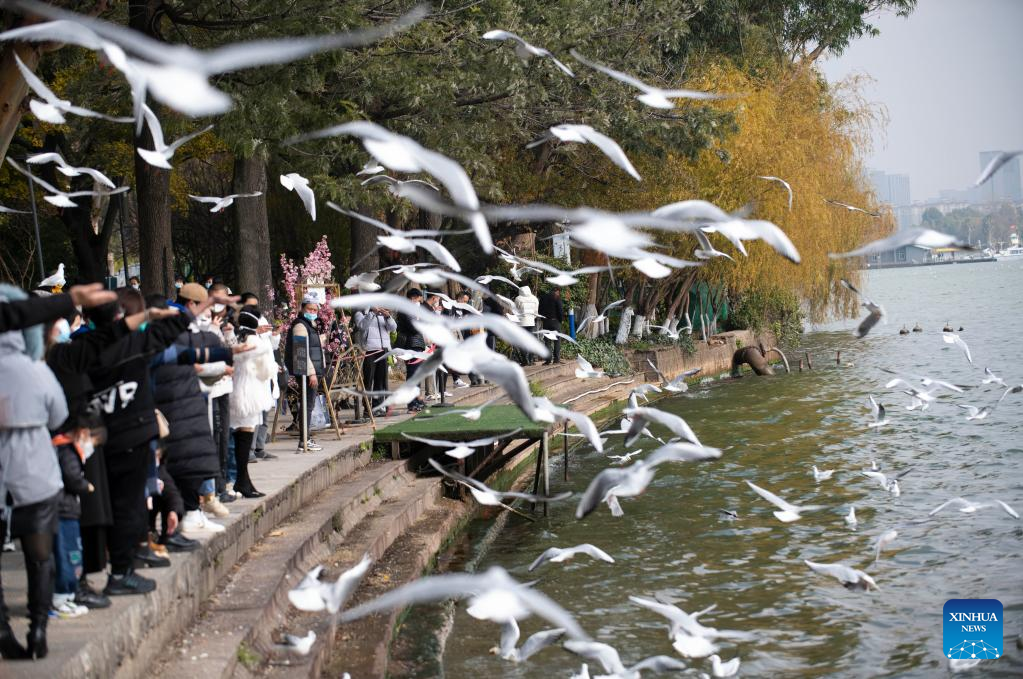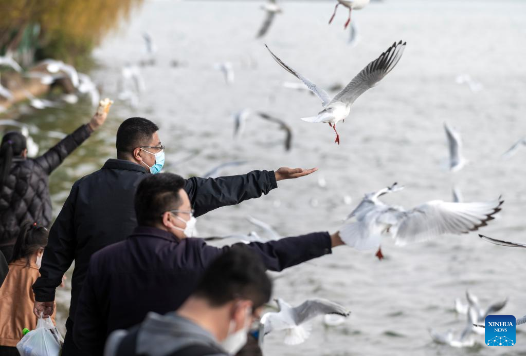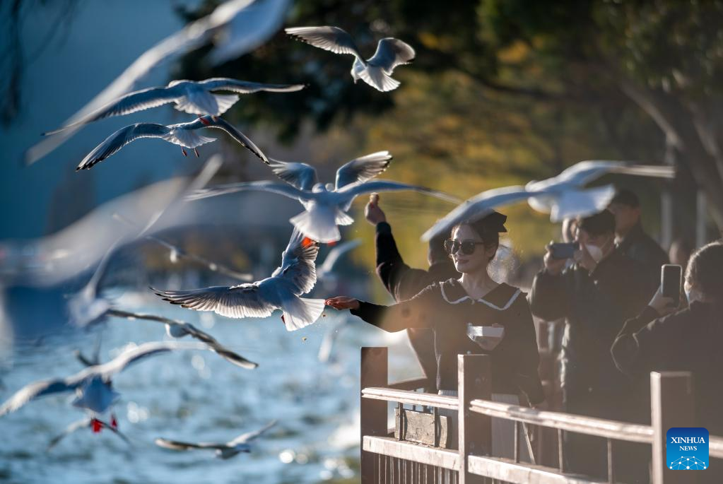 Visitors feed black-headed gulls at the Haigeng Park in Kunming, southwest China's Yunnan Province, Dec. 23, 2022. (Xinhua/Chen Xinbo)