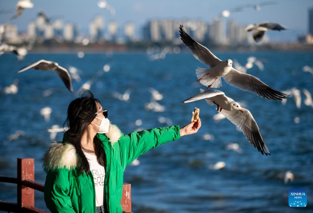 Visitors feed black-headed gulls at Haigeng east pier in Kunming, southwest China's Yunnan Province, Dec. 24, 2022. (Xinhua/Chen Xinbo)