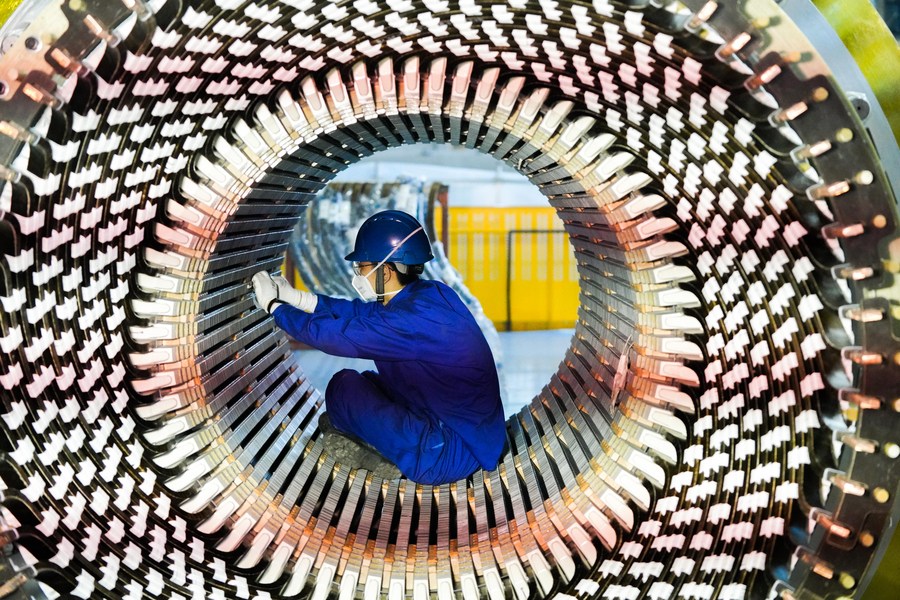 A worker works at a factory of Harbin Electric Machinery Company Ltd. of Harbin Electric Corporation in Harbin, northeast China's Heilongjiang Province, Sept. 3, 2022.(Xinhua/Wang Song)