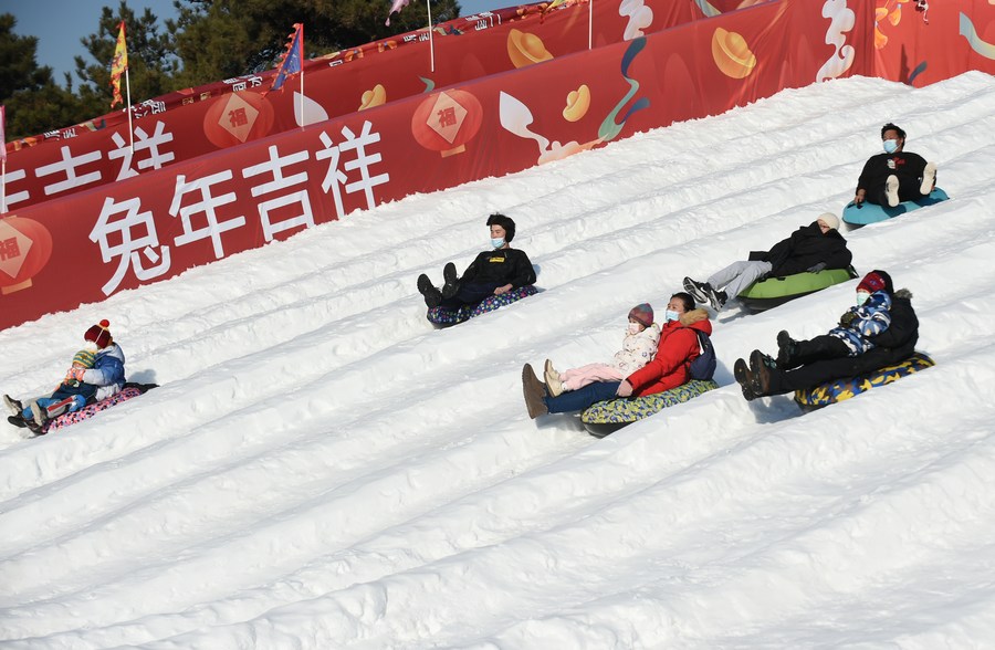 Visitors have fun during the ice and snow festival at Yuanmingyuan Park in Beijing, capital of China, Dec. 31, 2022. (Xinhua/Luo Xiaoguang)