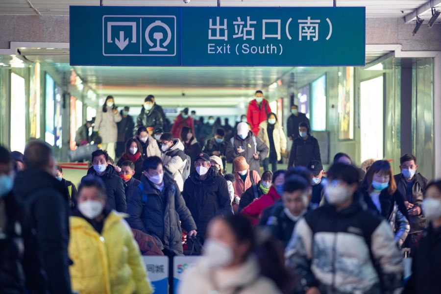 Travelers walk out of Nanjing Railway Station in Nanjing, capital of east China's Jiangsu Province, Jan. 2, 2023. (Photo by Su Yang/Xinhua)
