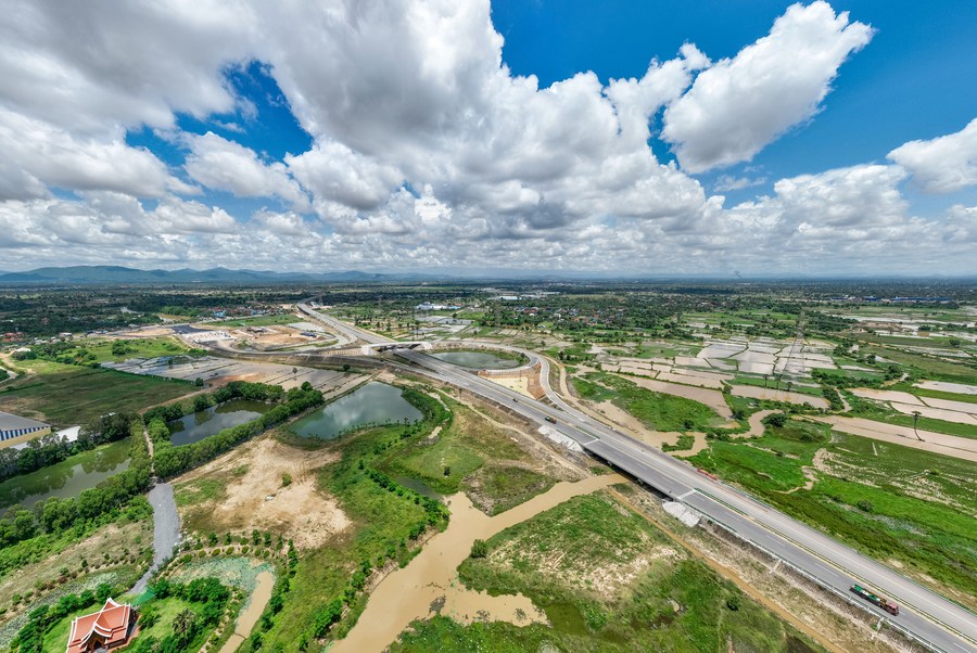 Aerial photo taken on June 24, 2022, shows the Phnom Penh-Sihanoukville Expressway project in Kampong Speu Province, Cambodia.(Photo by Li Zhen/Xinhua)