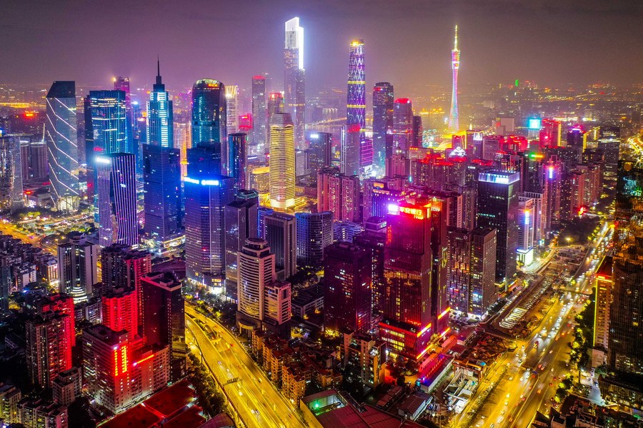 This aerial photo taken on Jan. 1, 2023 shows a night view of the commercial area around Tianhe Road in Guangzhou, south China's Guangdong Province. (Xinhua/Liu Dawei)