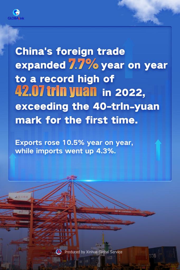 Total goods trade reached 42.07 trillion yuan, up 7.7 percent year on year, topping the world for six consecutive years, according to the General Administration of Customs (GAC). The figure exceeded 40 trillion yuan for the first time, said the GAC.