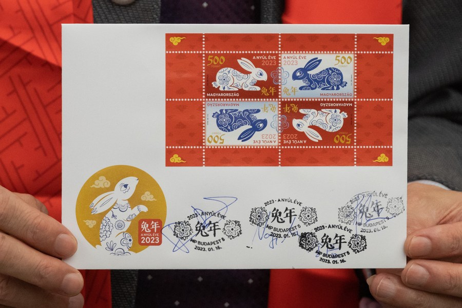 This photo taken on Jan. 16, 2023 shows a first-day cover with the stamps marking the Year of the Rabbit at Hungary's Stamp Museum in Budapest, Hungary. (Photo by Attila Volgyi/Xinhua)
