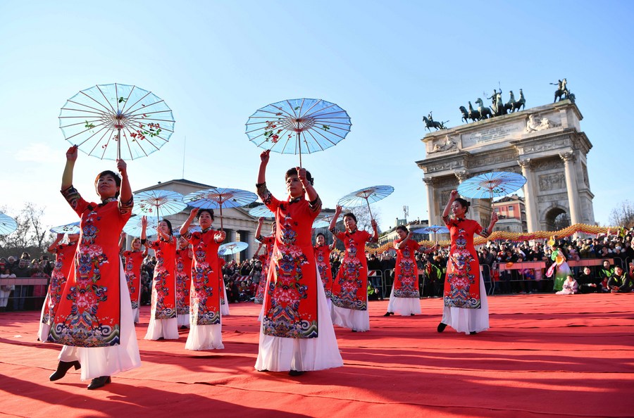 Dancers perform during a cultural event in celebration of the Chinese New Year in Milan, Italy, Jan. 22, 2023. (Xinhua/Jin Mamengni)