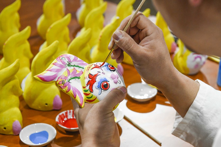 A craftsman colors a clay rabbit at a clay art workshop in north China's Hebei Province, Jan. 16, 2023. (Photo by Liu Mancang/Xinhua)