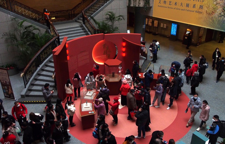 People visit a special exhibition for the Year of the Rabbit in the Shanghai Museum, Jan. 22, 2023. (Xinhua/Ren Long)