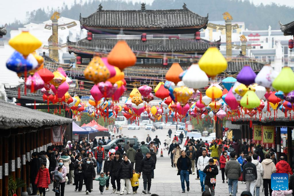 People tour Jiuzhou ancient town in Qiandongnan Miao and Dong Autonomous Prefecture, southwest China's Guizhou Province, Jan. 26, 2023. (Photo by Wang Chao/Xinhua)