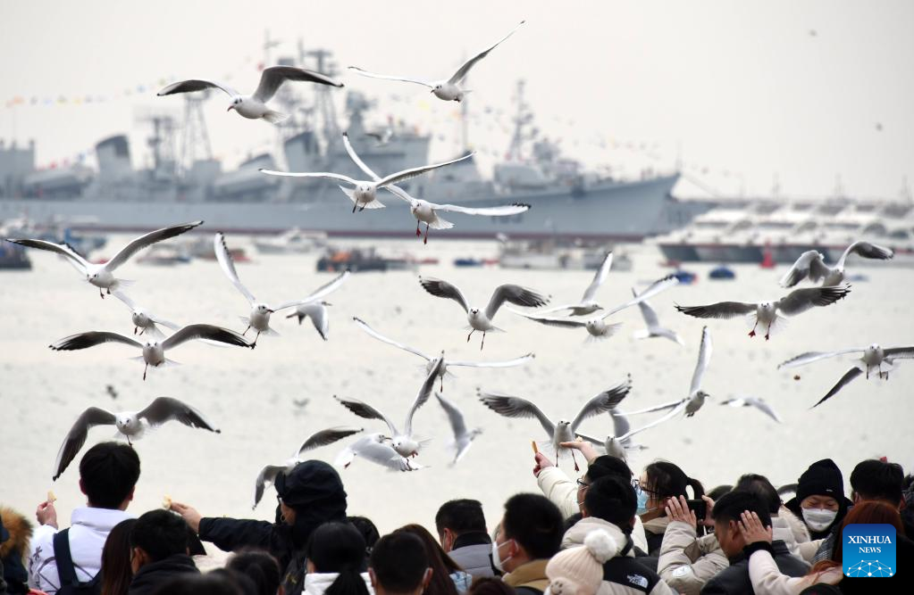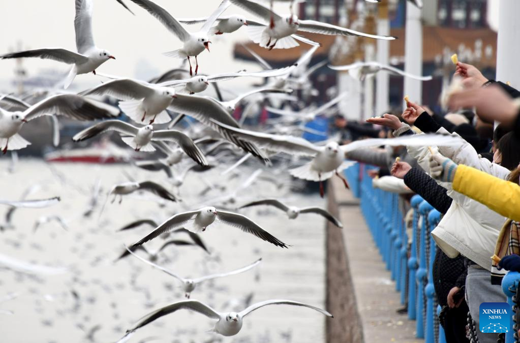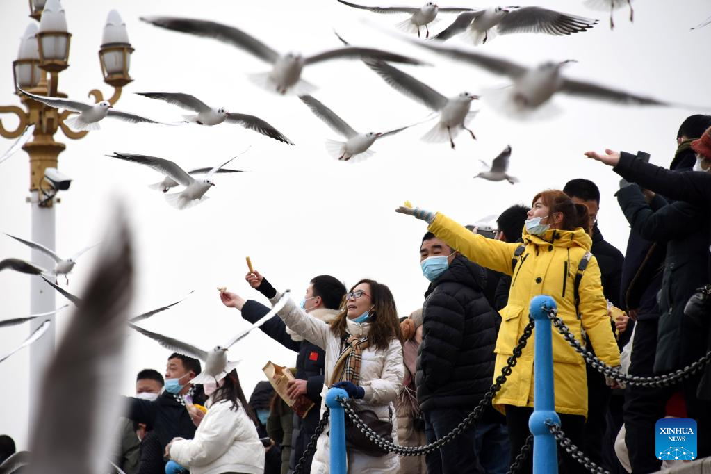 Visitors watch seagulls in Qingdao, east China's Shandong Province, Jan. 26, 2023. Watching seagulls during Spring Festival is a tradition in Qingdao. Nowadays, with the improvement of ecological environment, the species of seagulls in Qingdao has increased to over 20 and the amount has surpassed 100, 000. (Xinhua/Li Ziheng)