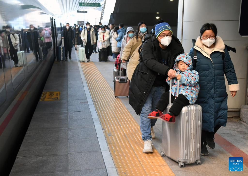 Passengers walk on a platform of Beijing West Railway Station in Beijing, capital of China, Jan. 27, 2023. Railway stations, highways and airports across China are bracing for a fresh travel peak as a growing number of travelers hit the road and return to work after a week-long Spring Festival holiday which ends on Friday. (Xinhua/Ren Chao)