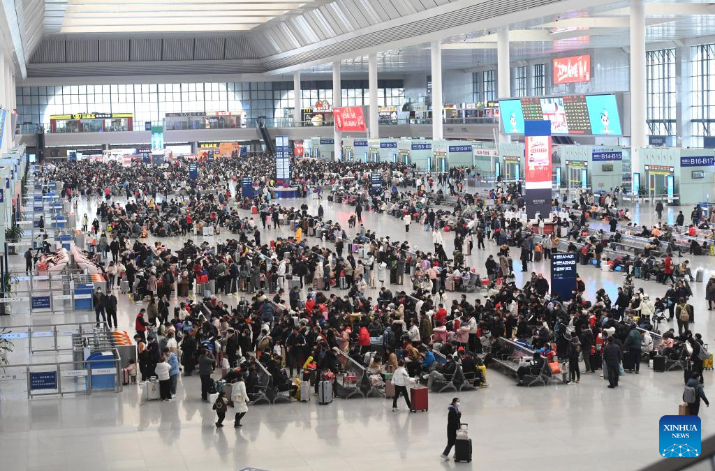 Passengers are pictured at Urumqi Railway Station in Urumqi, northwest China's Xinjiang Uygur Autonomous Region, Jan. 27, 2023. Railway stations, highways and airports across China are bracing for a fresh travel peak as a growing number of travelers hit the road and return to work after a week-long Spring Festival holiday which ends on Friday. (Xinhua/Ding Lei)