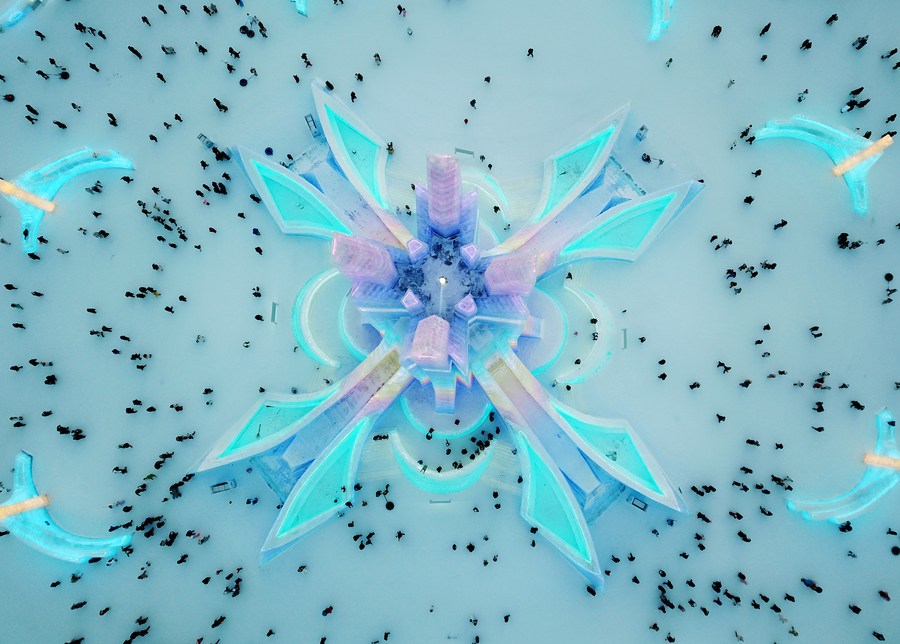 In this aerial photo, tourists visit the Ice-Snow World theme park in Harbin, northeast China's Heilongjiang Province, Jan. 25, 2023. (Xinhua/Wang Jianwei)