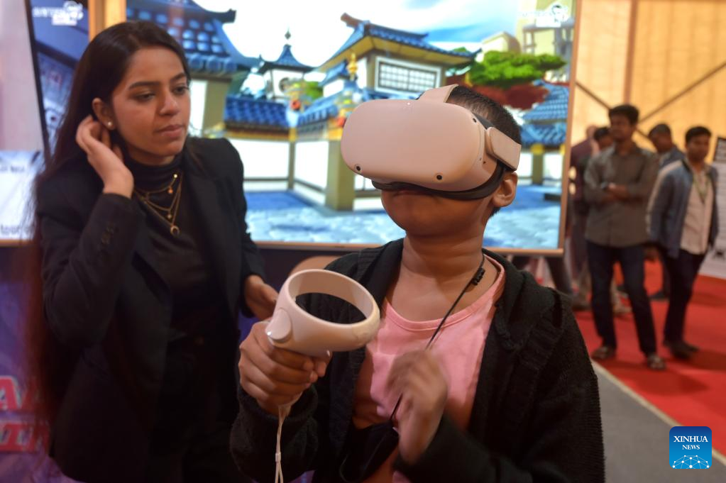 A visitor tries a virtual reality headset at Digital Bangladesh Mela (expo) in Dhaka, Bangladesh, Jan. 28, 2023. (Xinhua)
