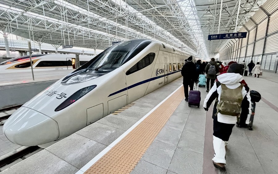 Passengers take the Beijing-Zhangjiakou high-speed railway at Beijing North Railway Station in Beijing, China on Jan. 24, 2023. (Xinhua/Li Xin)