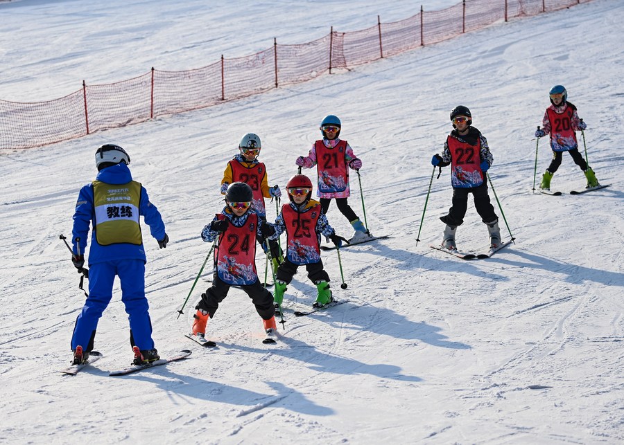 Children practice skiing at the Aoshan Ski Resort in Taibai County, northwest China's Shaanxi Province on Jan. 11, 2023. (Photo by Zou Jingyi/Xinhua)