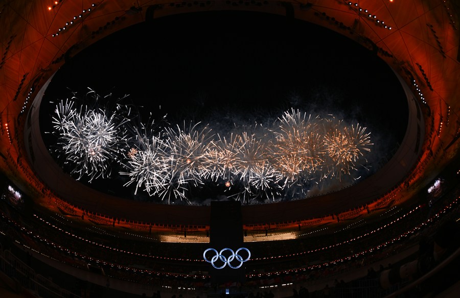 Fireworks illuminate the night sky during the opening ceremony of the Beijing 2022 Olympic Winter Games at the National Stadium in Beijing, China on Feb. 4, 2022. (Xinhua/Li Ga)