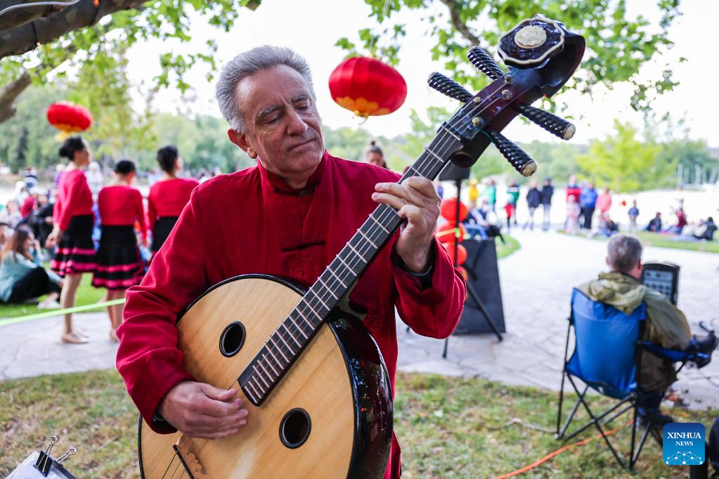 A man performs during an event in celebration of the upcoming Lantern Festival at the Beijing Garden by Lake Burley Griffin in Canberra, Australia, Feb. 4, 2023. The event featuring traditional music, dance and lantern show was organized by the Australia China Friendship Society Australian Capital Territory (ACT) Branch.