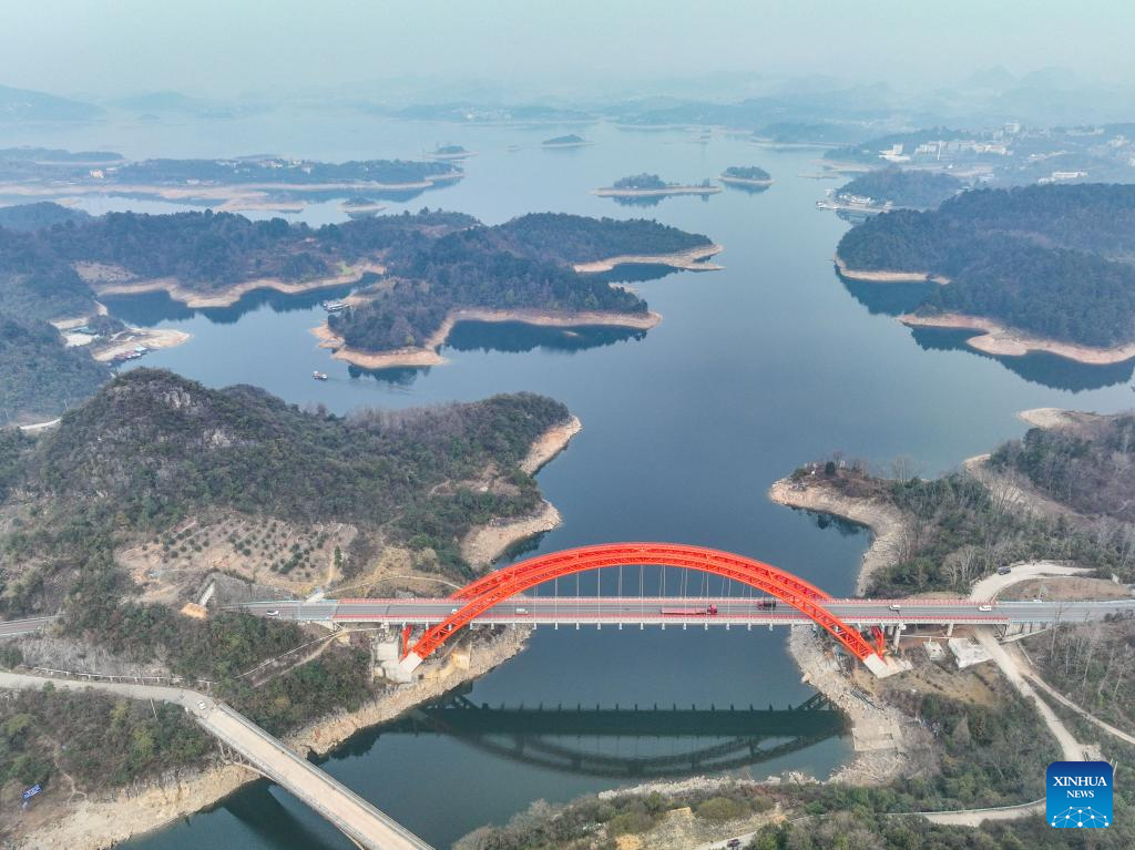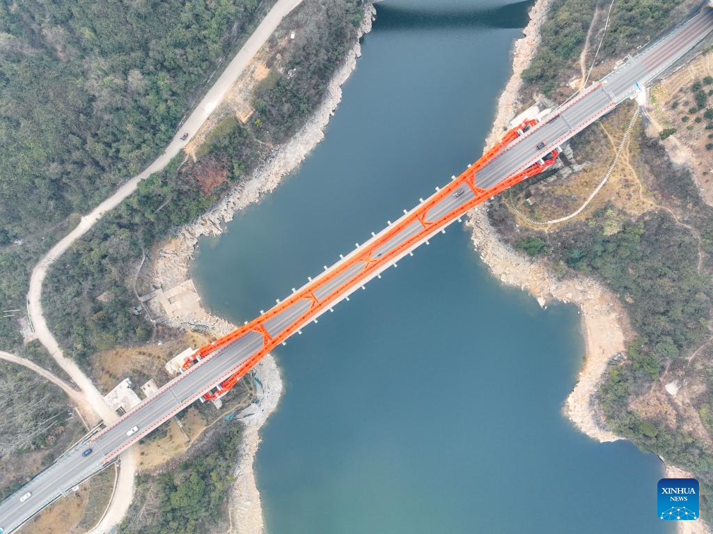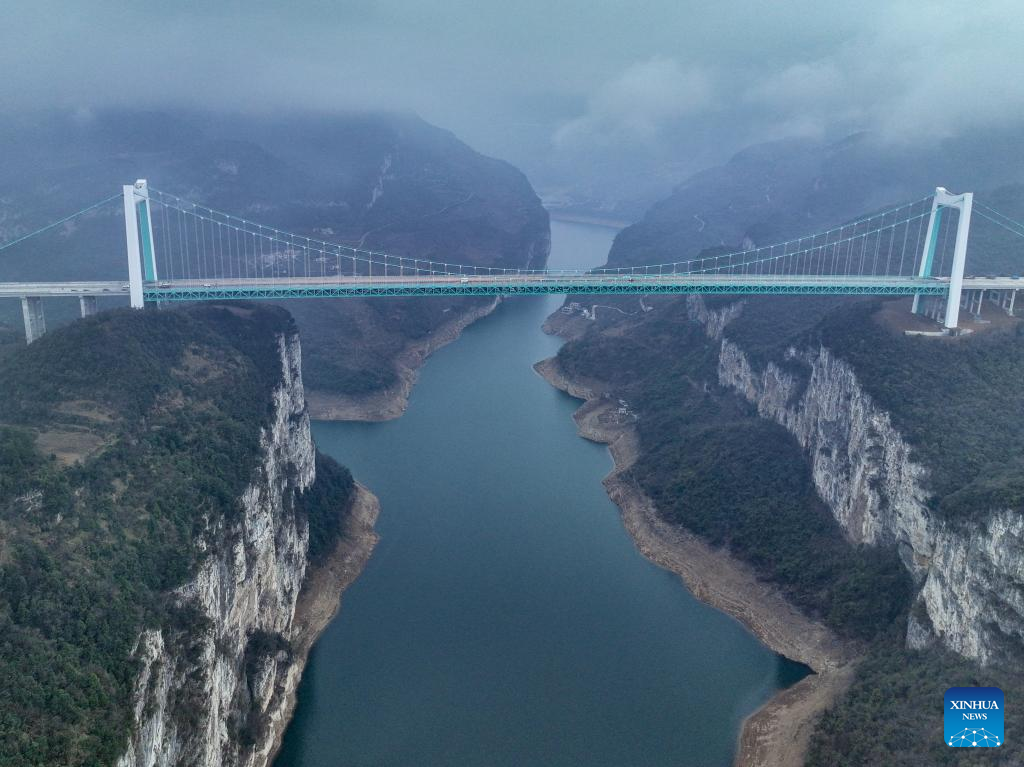 This aerial photo taken on Feb. 3, 2023 shows the Jinfeng Wujiang River bridge in southwest China's Guizhou Province. Guizhou has nearly half of the 100 tallest bridges in the world. Due to the large number of bridges, their types and complex technologies used in the construction of the bridges, the province is known as "the museum of world bridges". (Xinhua/Ou Dongqu)