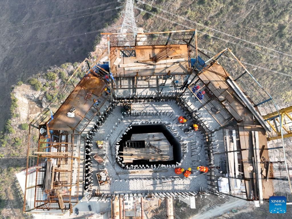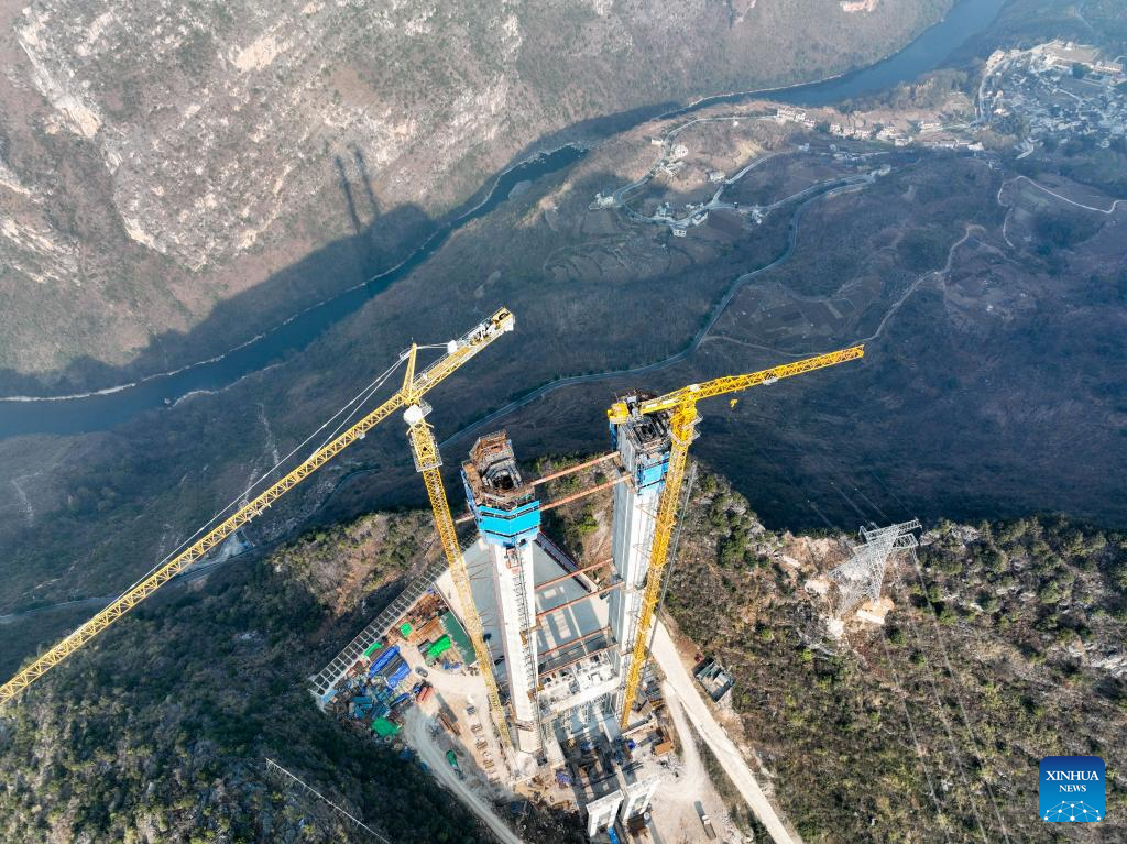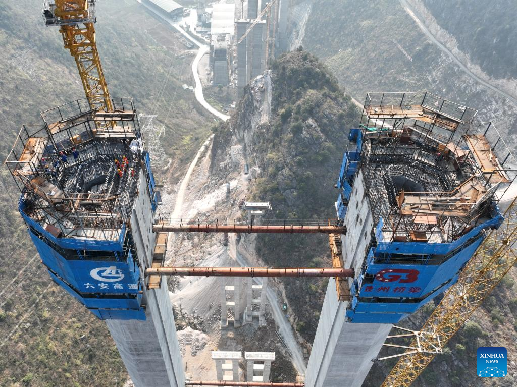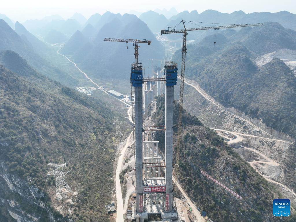 This aerial photo taken on Feb. 1, 2023 shows the construction site of a bridge across the Huajiang River canyon in southwest China's Guizhou Province. Guizhou has nearly half of the 100 tallest bridges in the world. Due to the large number of bridges, their types and complex technologies used in the construction of the bridges, the province is known as "the museum of world bridges". (Xinhua/Ou Dongqu)