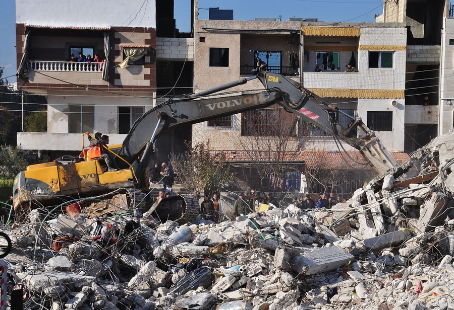 Rescuers work at an earthquake-hit site in Latakia, Syria, Feb. 10, 2023. (Str/Xinhua)