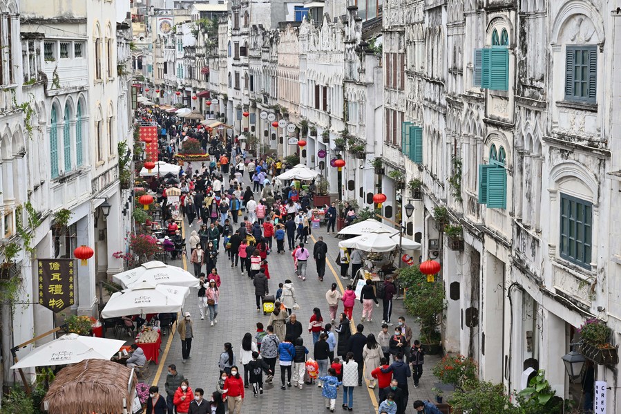 Tourists visit the Qilou ancient street during the Spring Festival holiday in Haikou, south China's Hainan Province, Jan. 27, 2023. (Xinhua/Guo Cheng)