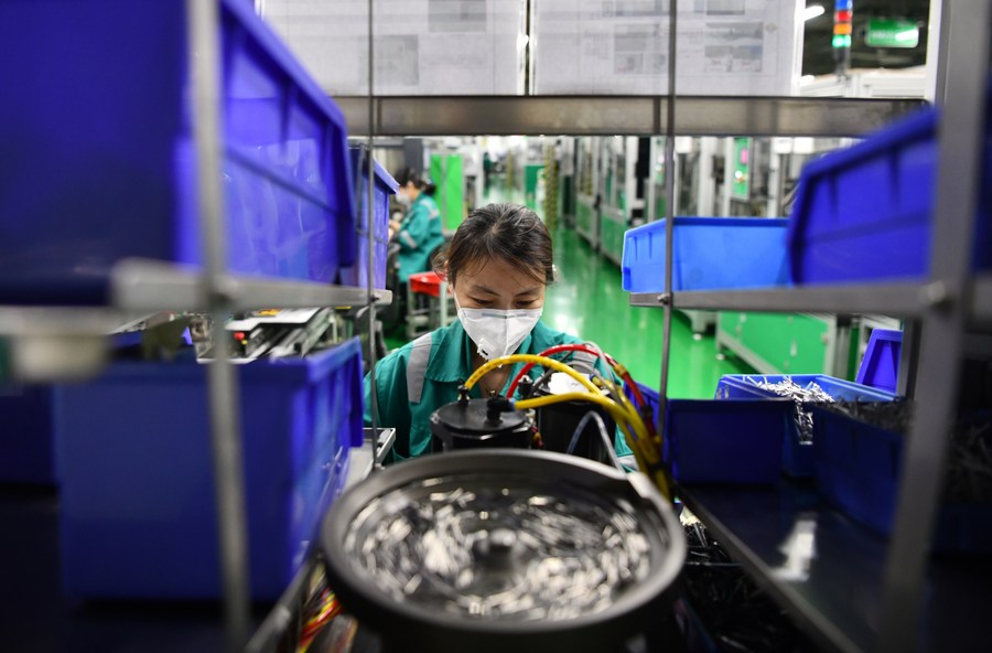 An employee works at Schneider Electric Low Voltage (Tianjin) Co., Ltd. in Tianjin, north China, Feb. 25, 2020. (Xinhua/Li Ran)