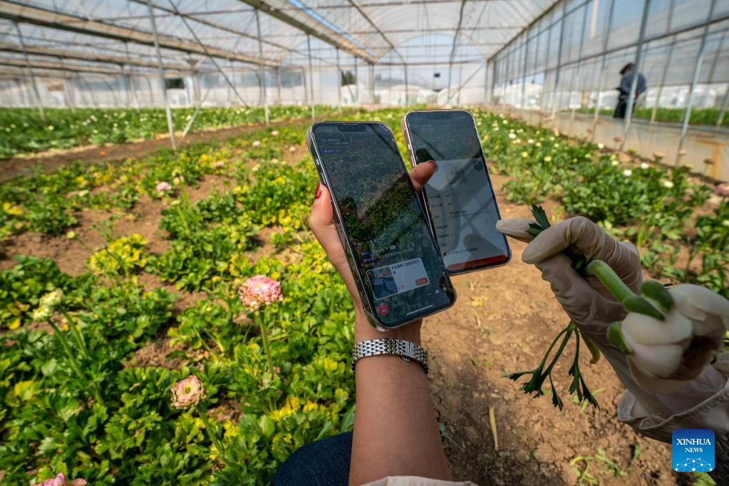 Bi Xixi hosts a live streaming show at her own flower field in Qujing, southwest China's Yunnan Province, Feb. 12, 2023.