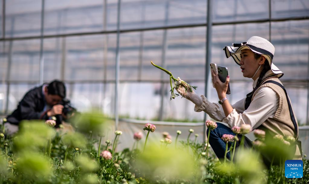 Bi Xixi picks fresh flowers at her own flower field in Qujing, southwest China's Yunnan Province, Feb. 12, 2023.