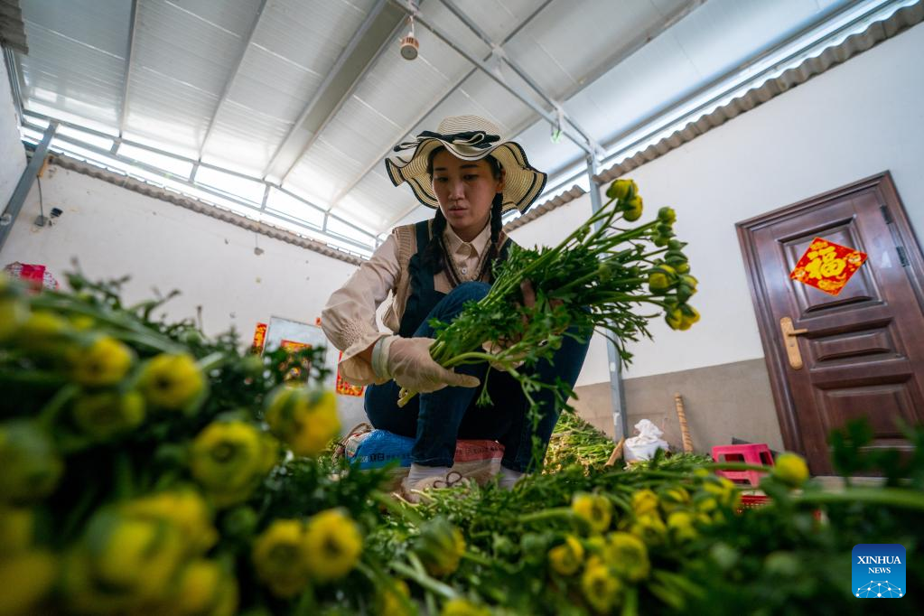 Bi Xixi sorts fresh flowers at her own flower field in Qujing, southwest China's Yunnan Province, Feb. 12, 2023.