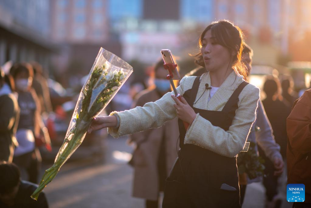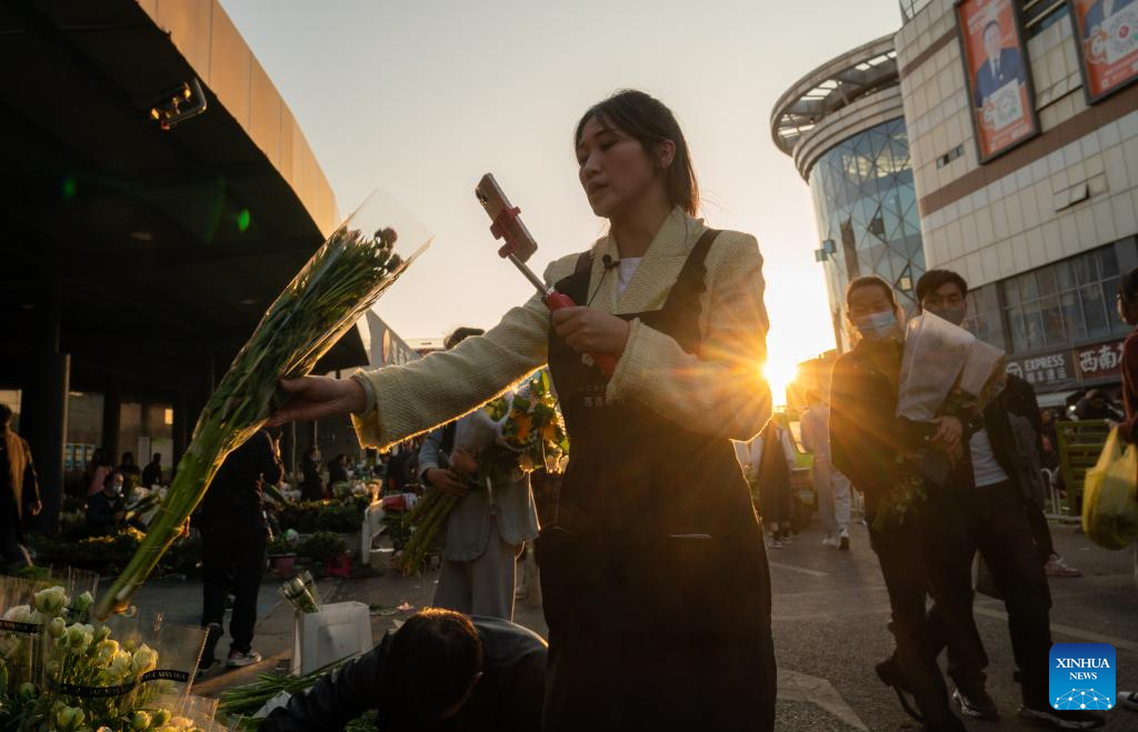 At Dounan Flower Market, often referred to as Asia's flower capital, traditional flower vendors have long been acquainted with flower-selling live streamers like Bi and their business mode. They are fully aware that thousands of flower lovers may be watching a live stream of the market on a mobile phone. (Xinhua/Jiang Wenyao)