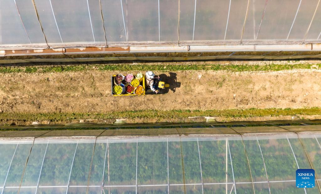 This aerial photo taken on Feb. 12, 2023 shows Bi Xixi transferring fresh flowers to be packed at her own flower field in Qujing, southwest China's Yunnan Province.