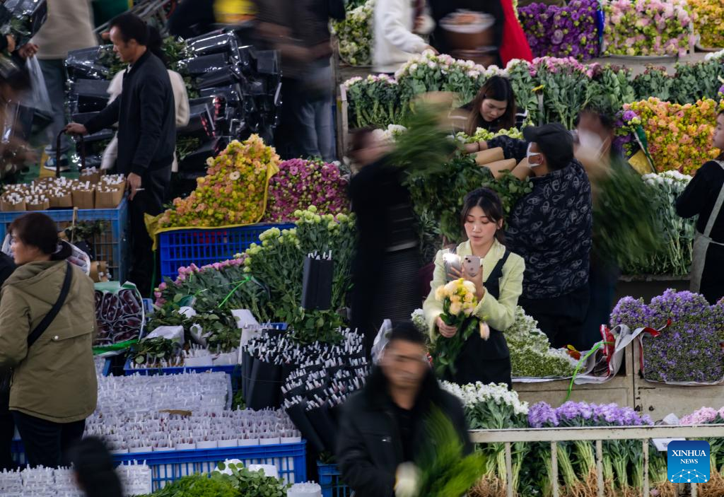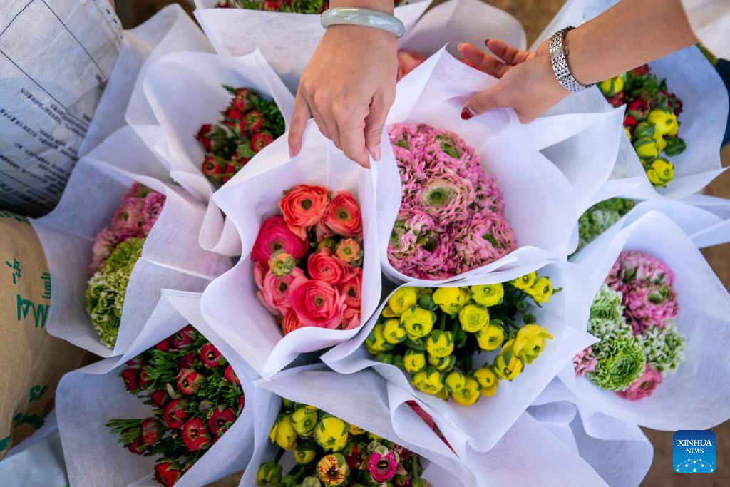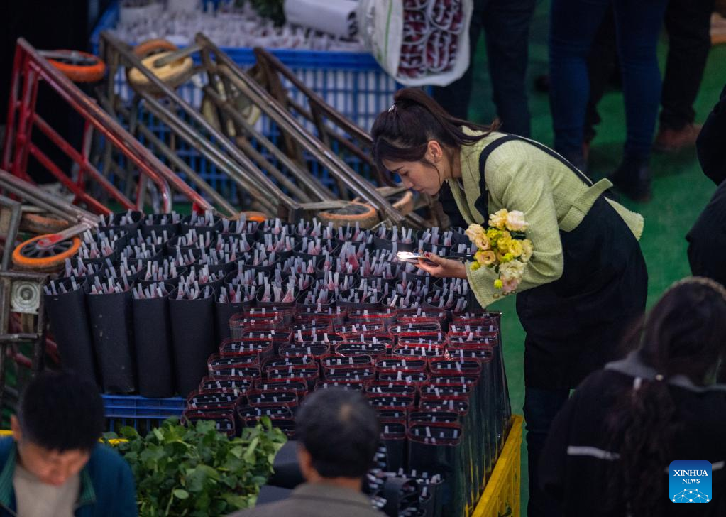 Bi Xixi selects flowers at Dounan Flower Market in Kunming, southwest China's Yunnan Province, Feb. 13, 2023.