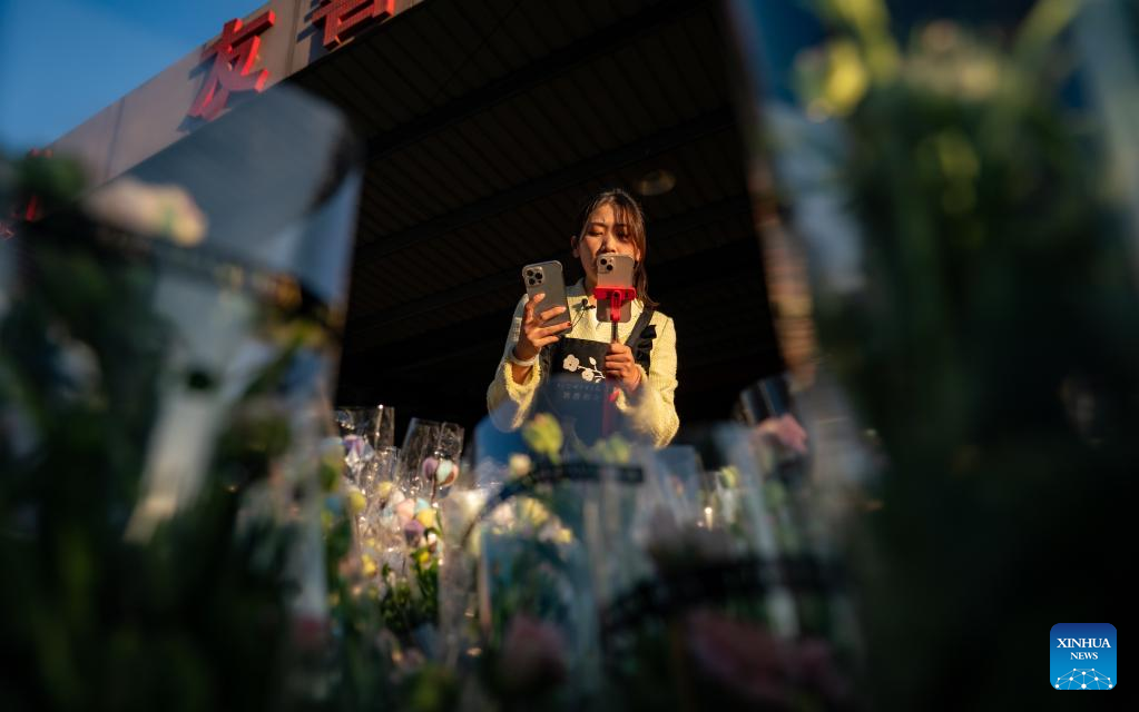 Bi Xixi hosts a live streaming show at Dounan Flower Market in Kunming, southwest China's Yunnan Province, Feb. 13, 2023.