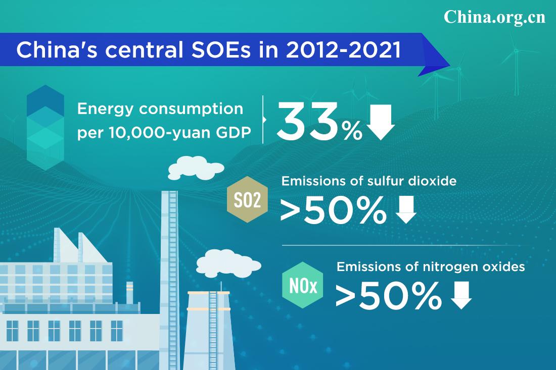 China's centrally administrated state-owned enterprises (SOEs) have vigorously pursued green and low-carbon industrial development in recent years, with their comprehensive energy consumption per 10,000 yuan of GDP falling by about 33% from 2012 to 2021.