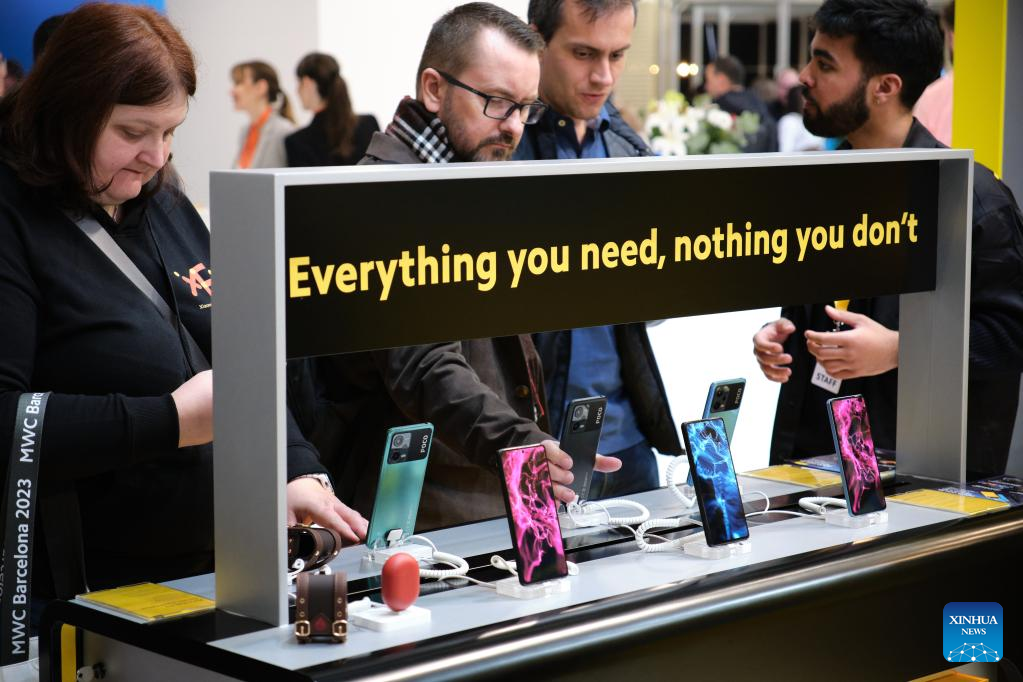 Visitors look at smart phones at the 2023 edition of the Mobile World Congress (MWC) in Barcelona, Spain, on Feb. 27, 2023. The 2023 edition of the Mobile World Congress (MWC) kicking off Monday in Barcelona saw a strong return of Asian participants, according to the organiser of the city's largest annual event. (Xinhua/Meng Dingbo)