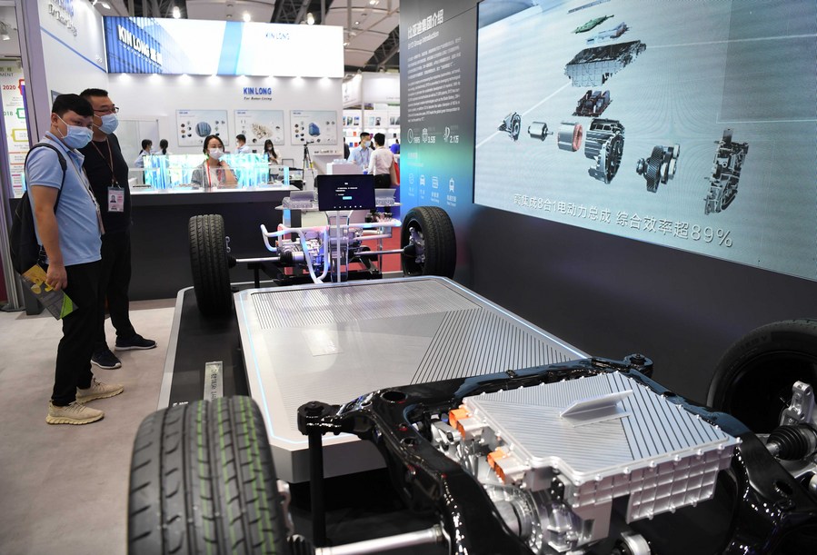 Visitors look at a blade-shaped battery produced by China's leading new energy vehicle (NEV) manufacturer BYD during the 130th session of the China Import and Export Fair, also known as the Canton Fair in Guangzhou, south China's Guangdong Province, Oct. 15, 2021.(Xinhua/Deng Hua)