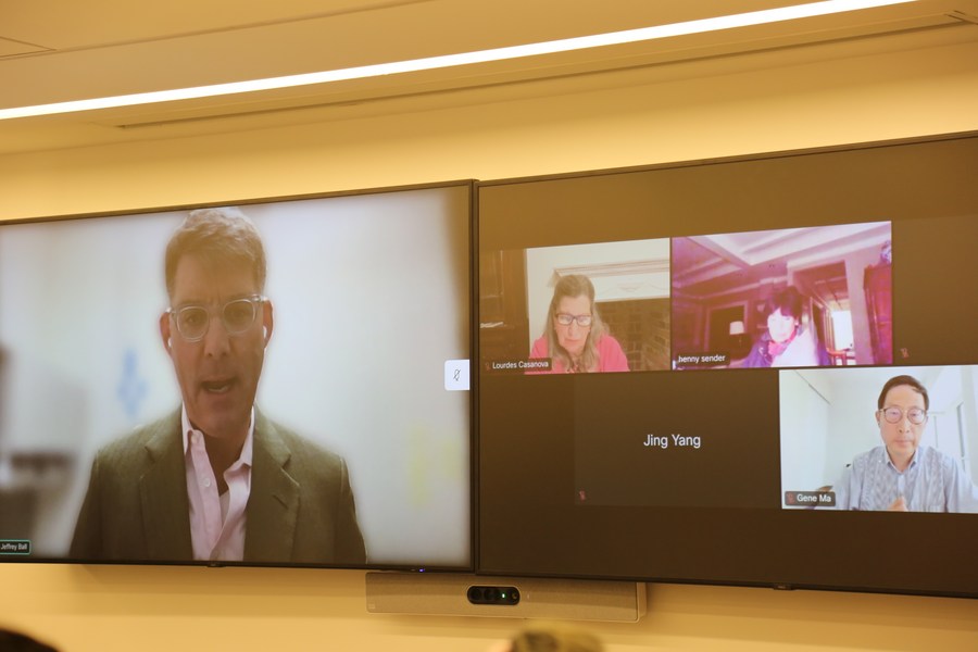 Jeffrey Ball (L, on the screen), scholar-in-residence at Stanford University's Steyer-Taylor Center for Energy Policy and Finance, makes remarks online during a panel discussion organized by the American Chinese Finance Association (ACFA) in New York, the United States, on Feb. 23, 2023. (Xinhua/Liu Yanan)